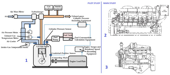 Schematic view of the pilot study equipment (1) and industrial engines being subjected to mathematical modelling: CAT 3512B HD-SC (2) and FPT Industrial Cursor 13 (3).