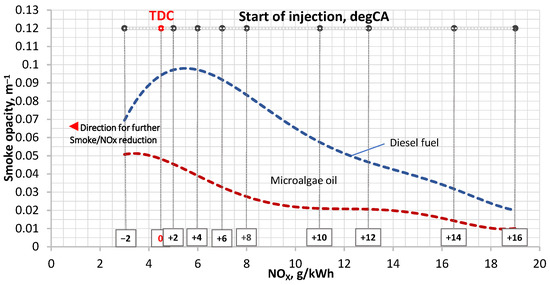 As shown in Figure 3, the original high values of smoke opacity in the case of diesel fuel operation are reduced by two-fold by replacing it with microalgae oil. As microalgae oil produces lower smoke opacity levels compared with D100 at the same engine control setting, there is a big potential for nitrogen oxide emission reduction through a proper engine readjustment aiming to significantly improve the NOx-smoke opacity trade-off. For the examined 1Z engine, the optimum approach was to retard the main injection timing (by 2 degCA) [31]. In that case, in addition to the reduction in smoke opacity levels predetermined by the simple replacement of diesel fuel with microalgae oil, further emission reductions were achieved leading to 41.2% (4.3 g/kWh vs. 2.5 g/kWh) lower engine-out NOx emissions for both unary fuels. Moreover, the interval of −2… 0 degCA can be described as the best setting of an engine for smoke and NOx stabilization and reduction: the first part of the interval related to 0 degCA demonstrated the same (and the second lowest) levels of NOx emissions for both tested fuels, while the second one showed a 22.2% and 2.0% decrease in smoke opacity levels for diesel fuel and MAO100, respectively. It is worth noting that, initially, the difference between smoke emission levels at 0 degCA for D100 and MAO100 was 49%, while the retardation of the SOI by two degrees relative to TDC reduced this difference to 29% (see Figure 3).