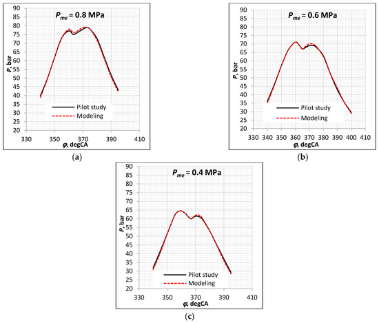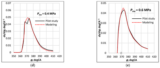 As previously described in Ref. [38], to minimize the mean absolute percentage deviation, we used a derivative version of the goodness-of-fit method that describes the correlation between the in-cylinder pressure diagram of a 1Z engine and the corresponding data from the pilot study along the combustion process, by finding the optimal values of injection system parameters due to the lack of their availability. Regarding the validation of MM, Figure 4 displays the comparison of experiments and numerical results for three load points of a 1Z engine running on pure microalgae oil. At the high load (0.8 MPa) operating point where the magnitudes of the brake mean effective pressure are greater, the values obtained during the pilot study and MM are within 1.3% of each other, and at the lower load points where the magnitudes of the BMEP are much smaller, the values are within 2.1% of each other for Pme = 0.6 MPa and 1.6% for Pme = 0.4 MPa (see Figure 4). The plots indicate a very good agreement between the measured and predicted values for brake mean effective pressure. It is worth nothing that the range of calculation errors (1.3–2.1%) was mainly characteristic to these parts of the curves, which show the pressure peaks exceptionally. Again, this is due to the magnitude of the BMEP values. In terms of peak pressure, the error remains lower than +/−1.5 bar and can be considered as acceptable. Overall, this work shows a methodology able to establish some parameters for optimum engine operation in high-pressure direct injection combustion mode. This was achieved through the analysis of combustion chamber pressure (Figure 4a–c) and heat release rate (Figure 4d,e). The resulting plots of heat release have high precision, leading to a reliable estimation of the process, that is critical to a good modeling of the selected types of diesel engines. The insignificant differences were obtained only around the piston position corresponding to the top dead center, which in turn was predetermined by the application of the single-phase vibe combustion model for diesel engines. In other words, microalgae oil performance was accurately approximated by a single linear segment, which means a single-phase form. The differences between the modelling and experimental outcomes of the heat release characteristics on average did not exceeded 2%, with the exception of dx/dφ peaks that show the 5–7% discrepancy in values. Figure 4 illustrates that the simulation data of the cylinder pressure and the heat release rate were in good agreement with the pilot study results; thus, the model was reasonable.