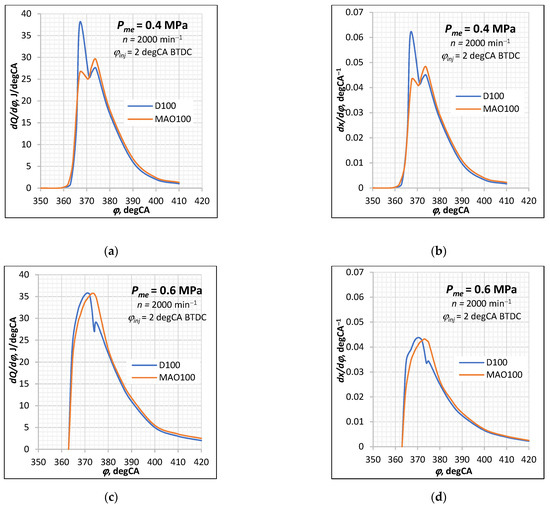 In this section, the impact of microalgae oil and diesel fuel on engine combustion characteristics is discussed in terms of HRR. Depending on the research aims, the characterization of the ongoing processes within engine cylinders are calculated using the experimentally obtained in-cylinder process. These are the heat release characteristics , expressed by differential equations, and the parameters of the in-cylinder processes, such as ignition delay, factor cycle dynamics (σ, λ, dp/dφmax), characteristic temperature and pressure (Tmax, Pmax), and others [39]. The dx/dφ is considered as the basic parameter describing heat release during the process of fuel combustion within the cylinders. The reliability of the results of mathematical modelling of the diesel engine parameters depends on the appropriate setting of dx/dφ [39]. HRR is affected by the amount of air-fuel ratio, SOI, and the thermodynamic properties inside the cylinder. The premixed phase of combustion ranges between the start of combustion (362 degCA for MAO100 and 363 degCA for D100) and the CA corresponding to the maximum value of heat flux (367 degCA for D100 and 374 degCA for MAO100) [21]. The early stage of the premixed combustion phase is associated with the rapid increase in in-cylinder pressure showing the highest peaks of HRR for diesel fuel at Pme = 0.4 MPa: 38 J/degCA and 0.063 degCA−1, (see Figure 5a,b). For the same load, MAO100 exhibited a longer duration of heat release during the premixed phase of combustion (~362.0… 373.8 degCA) with the maximum value of heat flux totaled at 29.5 J/degCA and 0.048 degCA−1. Engine performance at average load (0.6 MPa) demonstrated much more even HRR trends in terms of exhibited character of the maximum heat flux (35.7 and 35.2 J/degCA as well as 0.042 and 0.043 degCA−1 for D100 and MAO, respectively) if compared with Pme = 0.4 MPa (Figure 5c,d). During the assessment of heat release characteristics for the selected range of loads (Figure 5), the m and φz parameters demonstrated, on average, 10% higher values in the case of microalgae oil if compared with D100 as the reference fuel. The explanation for this lies in a fact that, during the early stage of mixing controlled combustion phase, a smaller portion of MAO was prepared for combustion during the ignition delay period due to the lower LHV, which in turn reduced the HRR. The values of m and φz will be applied for the modelling of CAT 3512B HB-SC engine as described in Section 3.3. The combustion cycle of a diesel engine: juxtaposition of pilot study outcomes vs mathematical modelling (φinj = 2 degCA BTDC, n = 2000 min−1).