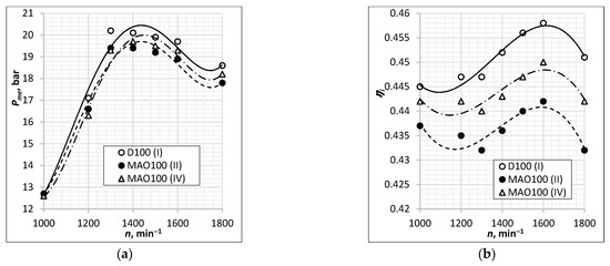 Combination of these parameters in similar proportions is characteristic to industrial heavy duty diesel engines equipped with an accumulator fuel-injection system common rail [23]. If comparing the changes in indicated efficiency () for the reference fuel and alternative fuel, the differences obtained at m = 0.5 did not exceed 2–3% (Figure 7b).