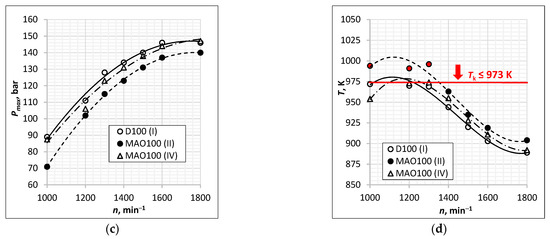 From the simulation outcomes of the CAT 3512B HB-SC engine running with MAO100, which clearly shows the untapped margin of maximum permissible values of the restrictive criterion Pmax (see Table 5), we found reasonable grounds for an improvement of the dynamic characteristics of ICE via further advancement of SOI as depicted in Figure 3 (Section 3.1). Hence, the MM outcome using the (IV) injection setting for CAT 3512B HB-SC engine running with pure microalgae oil (Tg ≤ 973 K, φinj = 2 degCA BTDC) was juxtaposed against (I) diesel fuel and presented in Table 6. Figure 6 presents the variation in break mean effective pressure, maximum cycle pressure (combustion pressure), indicated thermal efficiency, and exhaust gas temperature for the entire range of engine speeds (1800–1000 min−1) for the I (D100), II (MAO100), and IV (MAO100) injection strategies. Results revealed that the traction characteristics of a CAT 3512B HB-SC engine were significantly improved after the last correction of the injection settings. In comparing diesel fuel (I) and microalgae oil (IV), we found that the difference in indicated thermal efficiency now comprises only 0.7–2.0% (see Table 6) and the threshold value of 973 K for exhaust gas temperature was successfully reduced below the threshold level or, in the case of n = 1300 min−1, an obtained temperature level felt within the margin of experiment error (see Table 6 and Figure 6).