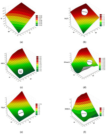A relative change in engine operational parameters when switching from diesel fuel to microalgae oil: (a) Indicated efficiency of an engine fueled by diesel fuel; (b) Indicated efficiency (change); (c) Hourly fuel consumption; (d) Maximum cycle pressure (combustion pressure); (e) Exhaust gas temperature; (f) CO2 emissions; RCoP Zone—the zone of rational combination of m and φz parameters).