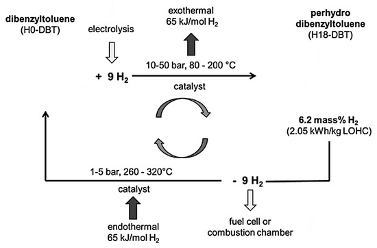 In comparison to these three systems, the perhydro-dibenzyl-toluene and dibenzyl-toluene (PDBT-DBT) system provides several advantages: (1) none of the components is carcinogenic, (2) liquid nature, therefore no handling, storage, and transportation issues, (3) lower vapor pressure of DBT allow easy release of hydrogen in the liquid phase, low vapor pressure is advantageous with respect to the safety and storage of PDBT-DBT, low vapor pressure means that these compounds can be stored at atmospheric conditions and when needed, these can be dehydrogenated via reaction, (4) lower volatility helps in obtaining comparatively higher purities of hydrogen, and (5) higher value of volumetric density [7,10,11,12,13,14]. Regarding the high energy requirements of dehydrogenation in this system, it has been reported that the process can be performed efficiently by using a micro-structured reactor [14,15]. Therefore, the PDBT-DBT system is taken as the LOHC system in this study. The overall working of the LOHC system is depicted in Figure 1 [16].