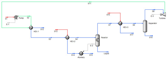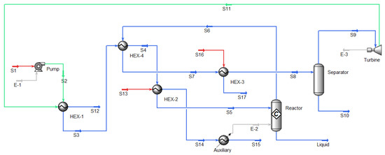 - Strategy #1: It is observed during the simulation, that stream S9 (consists of hydrogen) has a considerably high temperature, which can be extracted, i.e., power can be produced, and the hydrogen stream can exchange heat with the reactor feed (in HEX-1) to reduce the steam consumption in the system. The scheme is presented in Figure 3.