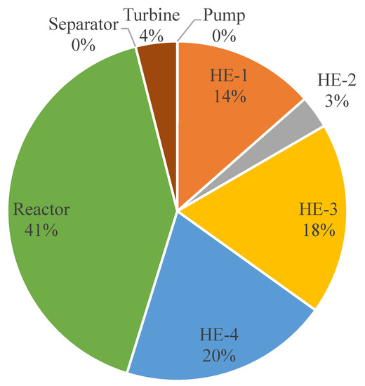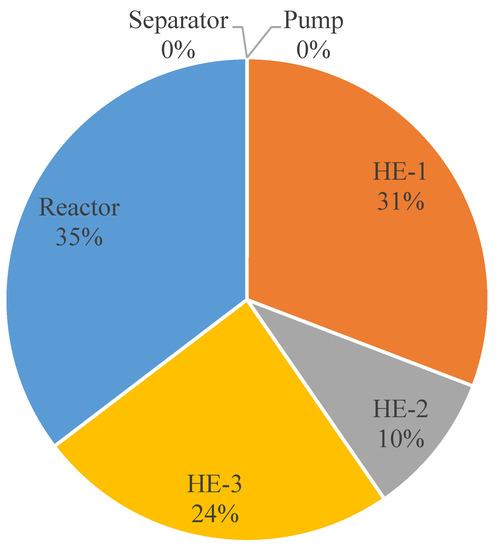 Figure 6. Contribution of different equipment in total exergy destruction rate—strategy #1 (%). - Strategy #2: hot utility consumption is reduced by 70.59%, while cold utility consumption is reduced by 30%, with an overall reduction in utility consumption by 48.65%, at an expense of installation of one extra heat exchanger. In this case, the turbine is comparatively producing lesser power, i.e., 359 kW in the system, because the product of the reactor (S7) is exchanging heat with feed stream (S3); therefore, comparatively lesser heat is available for electricity generation. However, in this strategy, the % exergy destruction rate is reduced by 14.28% in comparison to the base case. The % exergy destruction rate in heat exchanger #1 is reduced from 31 (base-case) to 14%, in heat exchanger #2, it is reduced from 10 (base-case) to 3%, and in exchanger #3, it is reduced from 24 (base-case) to 18%, as presented in Figure 7.