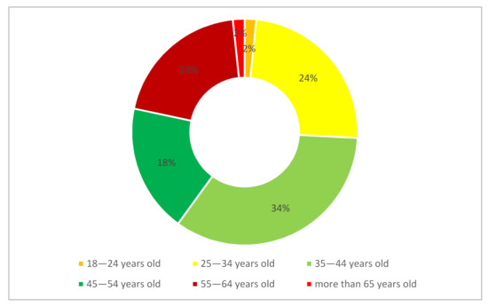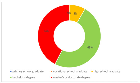 According to the educational structure, highly educated people predominate, namely, as many as 43% have a master’s degree or a doctorate, 49% have a higher or university education, and only 8% have a secondary education. The survey was mainly responded to by an environmentally aware population (see Figure 2).