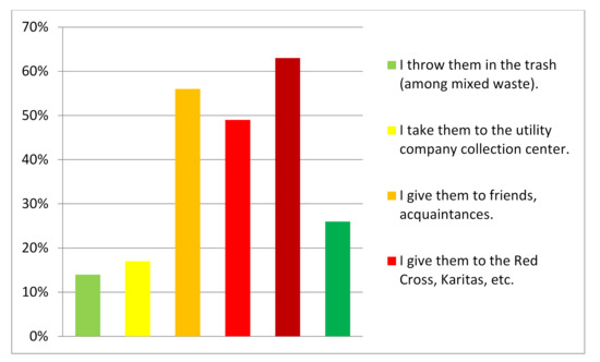 As many as 45% of the respondents buy most of their clothes new, but they are also given some or buy used ones. It should be noted that the majority of respondents live in a multi-member household where children are present, and in this regard accept or buy used clothes. This is also indicated by the answer that 17% of the respondents rarely buy new clothes, where most of them are donated. On the other hand, 36% of the respondents always buy new clothes. The need of the majority of Slovenes to buy new clothes was also perceived by the ethnologist Mateja Habinc [44], when she studied reasons why there are so few second-hand clothing shops in Slovenia. She found that new clothing in Slovenia is still ahead of used clothing, where the focus is on originality, uniqueness, nostalgia, or environmental awareness, which are common in Western Europe and North America [44,45]. She saw the reason for such an attitude towards buying second-hand clothes in the cult of the new, which was spread by mass socialist consumerism, which, among other things, equated buying second-hand clothes with poverty [44]. On a positive note, the respondents rarely throw clothes into mixed waste, at only 14%. They are most often taken to a Humana container with 63%, donated to friends, or acquaintances at 56% or the Red Cross, Caritas at 49%, 26% are processed or otherwise recycled, and 17% are taken to the collection center of the utility company (see Figure 4). Among mixed waste, the respondents, although very rarely, most often discard socks and underwear. Those who re-use textiles most often use them for cleaning cloths, mending children’s clothes, gardening, and the like.