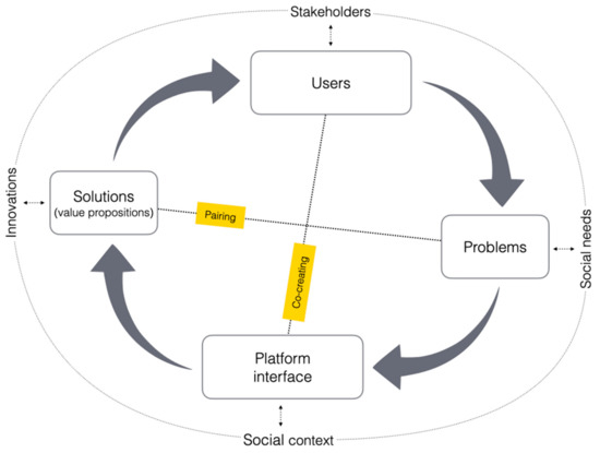The contribution of the introduced model is two-fold. First, it delivers the framework to capture the implicit processes of problem–solution pairing and value co-creation taking place in the digital platform ecosystem and realized through user actions mediated by the platform interface. Second, it delivers the framework to examine and understand the role of the wider social context for the processes of using a digital platform to develop sustainable entrepreneurship and innovation. Further operationalization of the model will allow the use of digital platforms to study these processes in real-life settings according to a living lab methodology.