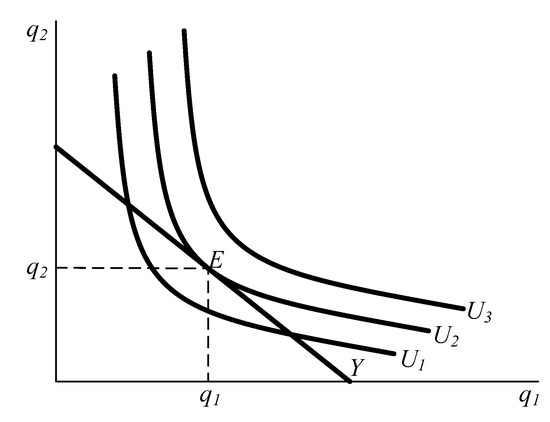 The indifference curve expresses consumer (user) preferences regarding the two products. The further from the origin the indifference curve lies, the higher the level of total utility it expresses. The consumer would, therefore, prefer the combination on a higher-situated curve to combinations lying along lower-situated indifference curves. The consumer’s budget limitation is given by the y-axis. If the consumer spends all their income, divided into expenditure on both products, the selected combination must lie on this line. Thus, point E is ideal for the consumer, representing the geometrical display of the highest attainable utility. There are numerous partial models of indifference analysis.