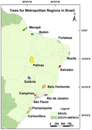 In Brazil, a group was formed to apply the same approach in each of their metropolitan regions: Trees for Metropolitan Regions. The 13 metropolitan regions (MR) and the 15 universities/institutions involved were: Universidade Federal da Bahia (Salvador MR), Universidade Federal do Pará (Belém MR), Universidade Federal de Minas Gerais (Belo Horizonte MR), Universidade do Estado de São Paulo campus Rio Claro and Universidade de Campinas (Campinas MR), Universidade do Extremo Sul Catarinense (Carbonífera MR), Universidade do Estado de Santa Catarina (Florianópolis MR), Universidade Federal do Ceará (Fortaleza MR), Universidade Federal de Goiás (Goiânia MR), Universidade Federal do Amapá and Secretarias do Estado do Governo do Amapá (Macapá MR), Universidade Federal de Tocantins (Palmas MR), Universidade Federal de Pernambuco (Recife MR), Universidade Federal Rural do Rio de Janeiro and Universidade Federal de Juiz de Fora (Rio de Janeiro MR), and Universidade do Estado de São Paulo (São Paulo MR) (