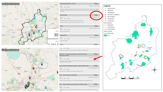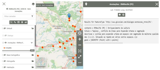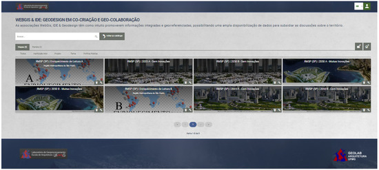 WebMap/WebGIS—WebGIS allows us to retrieve and visualize the information that is registered on the metadata catalog, as well as organizing it in ways that provide a clearer context of the data and its subsets. Furthermore, other functionalities were developed, which allow its use in shared decision-making processes and Geodesign. We used Mapstore2, but optimized by scripts and programming made by us. It is a highly modular WebGIS open-source software developed by GeoSolutions, to safely create, manage, and share maps and panels.