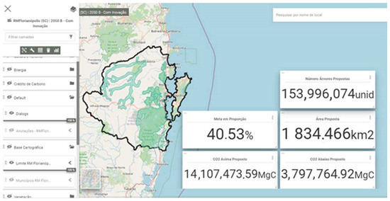 14] were used. As a supporting process for decision-making, an algorithm was included to perform the calculations regarding polygon areas in locations used for carbon sequestering. The results were presented as widgets, which dynamically inform participants of the percentage achieved by the proposals, total polygon area, the number of trees that will be inserted in that specific case study area (the amount is a function of the biome and local conditions), and how much CO2 sequestering will be generated above and below soil (measured in MgC units). To reach these values, the widget would calculate today’s robust vegetation sequestering rate for each case study, define the average of trees in these existing areas, and project what a 30% increase would mean. The script would then measure what was proposed and present the partial results, providing participants with their group’s performance (