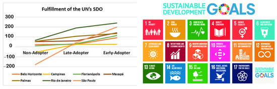 As a way of analyzing the fulfillment to the SDG, each idea proposed in the plans is associated with at least one of the 17 objectives. With this indexing, it is possible to compute how many and which of the objectives were met in each theme (water, vegetation, transportation, housing, among others). For each constructed scenario (Non-Adopter, Late-Adopter, and Early-Adopter), the sum of the achieved score is obtained, which is recorded on the “y” axis of the graph in