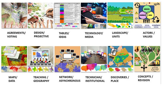 Although a single script was planned for all groups, with a conceptual base and justifications on how to conduct the required tasks on the platform, for each of the days in the workshop, each group adapted the method to their local reality, proving the scalability of the process and the necessary flexibility for employment in different realities: (1) negotiation and voting; (2) projective design; (3) tables and ideas; (4) technology and media; (5) landscape and units; (6) actors and values; (7) maps and data; (8) teaching and geography; (9) networks and asynchronicity; (10) technical and institutional; (11) discoveries and the location; (12) revision concepts (