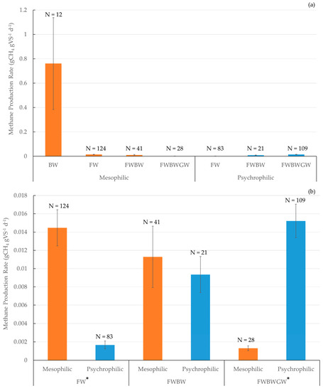 - Labatut, R.A.; Angenent, L.T.; Scott, N.R. Biochemical Methane Potential and Biodegradability of Complex Organic Substrates. Bioresour. Technol. 2011, 102, 2255–2264. [Google Scholar] [CrossRef] [PubMed]