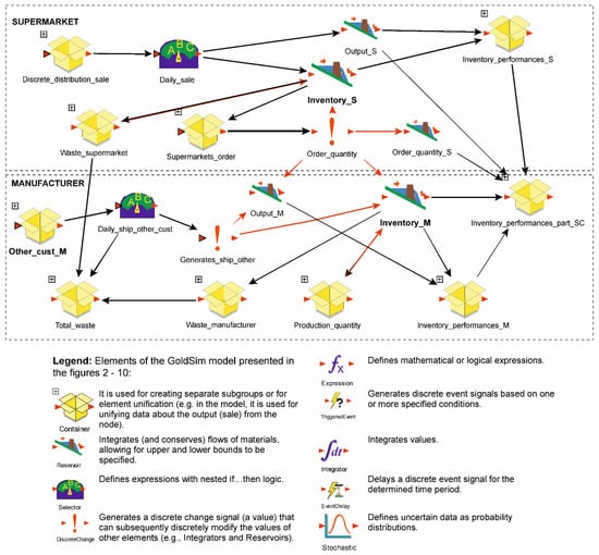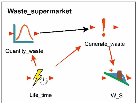 In order to calculate the waste in the model, three subgroups of elements are used: “Waste_supermarket”, “Waste_manufacturer”, and “Total_waste”. The quantity of expired products in the supermarket is calculated in the subgroup “Waste_supermarket” (Figure 5). This group of elements is, in accordance with Equation (2), related to the inventory level (Inventory S), i.e., to the stock filling quantity (Order_quantity) and the sales quantity (Daily_sale). Elements Quantity_waste and Life_time (follows exponential distribution with rate δ) define product shelf-life characteristics (product is perishable and inventory can be composed of units of different ages), event type, and event rate (withdrawal of a product from sale), while element Generates_waste initiates withdrawal of expired products (when the defined conditions are met). The element “W_S” accumulates the total waste generated in the supermarket.