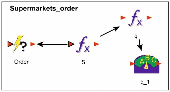 Subgroup “Supermarkets_order” (Figure 3) groups the elements that define and launch a new order to fill stocks (“Order_quantity”). Depending on the existing (current) quantity of products in the supermarket (“Inventory_S”), defined conditions for starting an order (“Order”), and rules for calculating the order quantity (defined in elements: “S” and “q”), element “q_1” determines the quantity of the order (this element uses if–then logic to define the quantity of the order that changes as a function of the state of the element “q”). “Order_quantity” is the discrete change element that triggers the ordering event by emitting a discrete change signal. This element generates a new order (defined in “q_1”) that leads to a change in the elements “Inventory_S” and “Inventory_M”. Additionally, “Order_quantity_S” is also used as control elements to check the compliance of the model results with the values collected in the real system.