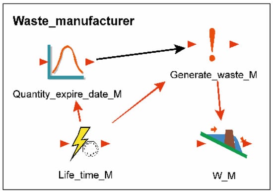Subgroup “Waste_manufacturer” (Figure 6) is based on the same structure of elements as for the supermarket, but with parameters (type of event, rate) related to the manufacturer.