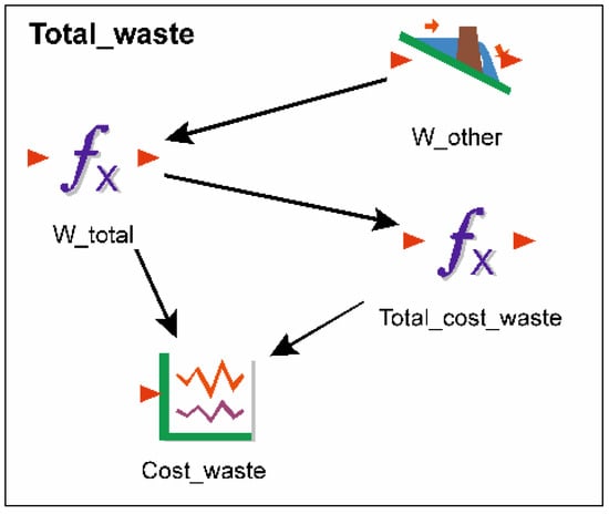 Subgroup “Total_waste” (Figure 7), through the element “W_total”, summarizes the total waste generated in the supermarket, other customers, and producers and calculates the cost of waste.