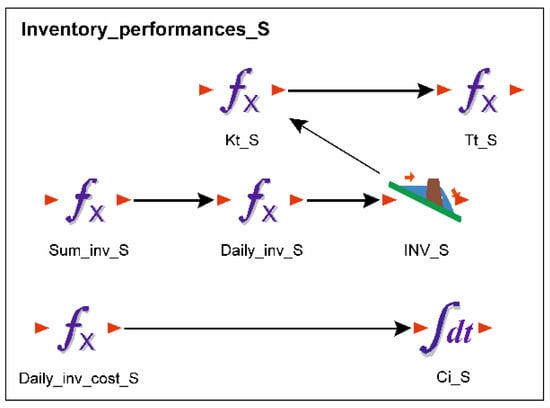 To calculate other stock indicators in the model, three subgroups were used: “Inventory_performances_S”, “Inventory_performances_M”, and “Inventory_performances_part_SC”. Subgroup “Inventory_performances_S” (Figure 8) combines the elements for determining the indicators of stocks in the supermarket. The element “Sum_inv_S” summarizes the daily stocks for a year. The element “Daily_inv_S” calculates the average daily stocks (according to Equation (1)) whose value is conserved in “INV_S”. The element “Daily_inv_cost_S”, in accordance with Equation (3), calculates the daily cost of inventory. The values determined in this way are accumulated in “Ci_S”, which results in the annual costs of stocks in the supermarket. The stock turnover ratio in the supermarket is (according to Equation (4)) calculated in the element “Kt_S”, and the stock turnover time is determined in the element “Tt_S” (according to Equation (5)).