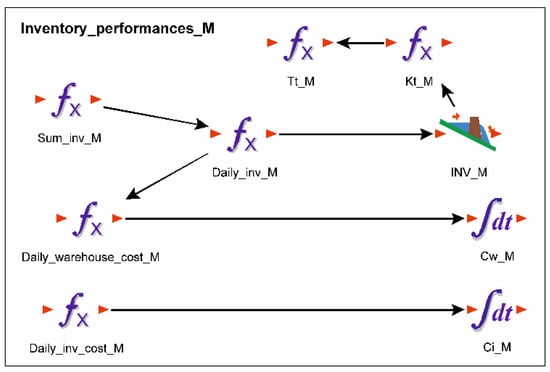 Subgroup “Inventory_performances_M” combines the elements for determining the stock indicators in the manufacturer’s warehouse (Figure 9). Determination of average stocks (“INV_M”), stock costs (“Ci_M”), stock turnover ratio (“Kt_M”), and turnover time (“Tt_M”) is based on the same element structure as for the supermarket but with stock parameter values at the manufacturer. Additionally, storage costs are determined here using the elements “Daily_inv_M”, which calculates average daily stocks, and “Daily_warehouse_cost_M”, which calculates daily storage costs according to Equation (6). The values thus determined are cumulated in “Cw_M”, thus obtaining the annual storage costs.