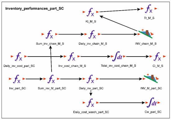 Subgroup “Inventory_performances_part_SC” includes elements for determining inventory indicators that refer only to a part of the chain, i.e., on the flow of material between the manufacturer and the supermarket (Figure 10). The same logic is used here as when determining the indicators of stocks in the supermarket and at the manufacturer, but the number of elements is slightly higher because the flow that ends in the supermarket is separated from the total flow of materials from the manufacturer (based on data taken from the completed questionnaire at the manufacturer). For example, the elements “Inv_part_SC” and “Sum_inv_M_part_SC” made it possible to separate the part intended for the supermarket from the daily stocks of the manufacturer. These stocks are summarized with the daily stocks in the supermarket for one year (“Sum_inv_chain_M_S”). The “Daily_inv_chain_M_S” element is used to calculate average daily stocks for the part of the product flow between the manufacturer and the supermarket. This value is stored in “INV_chain_M_S”.