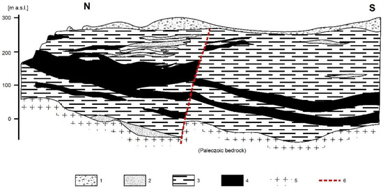 Schematic geological cross-section of Turów lignite deposit: 1—Quaternary, 2—sand, 3—clays, 4—coal, 5—granites, 6—fault (adapted from [10]).