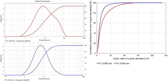 The analysis results indicated that the two clay samples had very small particles (Table 2, Figure 3). The clay sample contaminated with lignite grains (Z/−63) had noticeably smaller particles. More than 93% of this sample consisted of grains below 20 μm, while the D/−63 clay sample contained 77% of such grains.