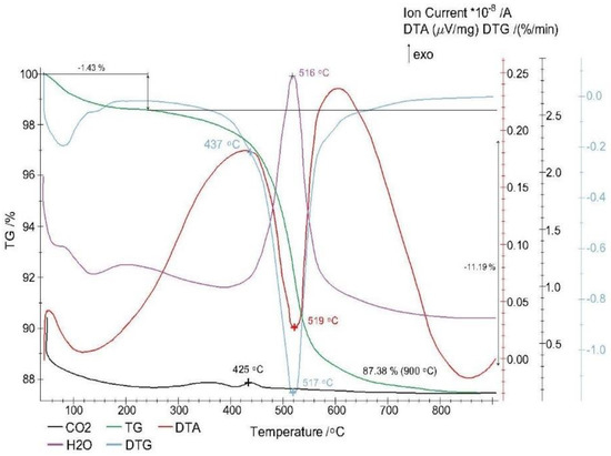 The tests also included an additional differential thermal analysis (DTA, red line), thermogravimetric (TG, green line) analysis, differential thermogravimetric analysis (DTG, blue line), released gas analysis CO2 (black line), and H2O (violet line). An approx. 35 mg sample was placed in the crucible with Al2O3 and heated from a temperature of 40 to 900 °C at a rate of 10 °C/min with airflow of 30 mL/min. The conducted thermal analysis allowed us to determine the ranges of temperatures characteristic for such processes as dehydration and dehydroxylation of clay minerals (Figure 4, Figure 5, Figure 6 and Figure 7).