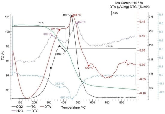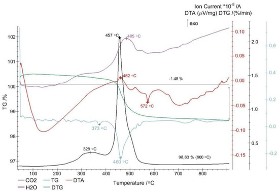 The sample D/+20 μm heated to 900 °C lost 1.48% of its original mass. At 329 °C, the first lower maximum of CO2 separated from the sample was observed (Figure 5). Some separation of H2O was also observed, albeit without a clear maximum in this temperature range; these effects correspond to a minimum on the DTG curve at 373 °C. At 457 °C, a second, much higher maximum of CO2 separation was observed, and at 485 °C, maximum of H2O separation was observed. The separation of these gases corresponds to a minimum on the DTG curve at 460 °C. The separation of CO2 and H2O is related to the exothermic effect with a maximum on the DTA curve at 462 °C. The exothermic effect may indicate an oxidation reaction in the sample. At 572 °C, a considerable endothermic effect was observed, which can be related to the polymorphic transformation of quartz β into quartz α.