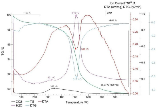 The first mass decrease in sample Z/−20 μm was 1.22% and is accounted for by the evaporation of chemically bound water (Figure 6). Another mass decrease of 9.41% is related to the separation of H2O and CO2. Low maxima were observed of H2O separation at 331 °C and CO2 separation at 343 °C. A second, much higher maximum of H2O separation at 516 °C corresponds to a minimum on the DTG curve at 511 °C and to the endothermic effect with a minimum on the DTG curve at 508 °C.
