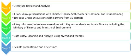 The study used a qualitative research approach, including a document review and analysis that provided a systematic procedure for identifying, analysing, and deriving useful information from existing documents. A review was conducted of the international literature on climate change finance and the context where this takes place in Africa and Zimbabwe. The review was meant to establish current trends in other developing or developed countries. The selection of the review documents was informed by the success stories that have advanced their work in climate finance. In particular, reference was made to the Rwanda Green Climate Fund, the Kenya Climate Finance Department in the Ministry of Finance, and the Development Bank of Southern Africa Climate Finance Facility. Zimbabwe climate change policies and strategy documents were also reviewed to understand the funding required to support climate action in Zimbabwe and how it could be mobilised for high-priority sectors. Additionally, themes were identified that clarified the envisaged future of climate finance in Zimbabwe. This was achieved through focus group discussions (FGDs) conducted with different stakeholders using nonprobability targeted sampling. This included government ministries and parastatals (e.g., Ministry of Finance and Economic Development, Ministry of Agriculture, Ministry of Environment, Climate Change Management Department, Environmental Management Agency, etc). Local authorities, non-governmental organisations, academia, development partners, and the private sector were also included in the sample. FGDs were also conducted with farmers from purposively sampled districts (Domboshava, Lupane, Chirumanzu, Seke, Chiredzi, Mberengwa, Bulilimamangwe, Gwanda, Zvishavane, and Gutu) across different agro-ecological zones about the different adaptation strategies that they were applying. Focus group discussions for the stakeholders included 10 questions that determined what they understood by climate finance and what Zimbabwe could do to mobilise climate finance in the future. One national FGD and three sub-national FDGs were held, whilst 10 FDGs were held with a total of 133 farmers drawn from the 10 provinces sampled. Each FDG was limited to 2 h, and ethical considerations including informed consent and anonymity were observed. The farmers’ FDG guide contained 15 questions including understanding the impacts of climate change and the adaptation strategies that they were employing to address it and enhance their long-term capacity to cope with it. Key informant interviews were conducted with the Ministries of Environment and Finance as the primary stakeholders in the climate finance field. For this purpose, an interview guide with 10 questions was created. It was grouped into three themes that related to climate change policy, climate change adaptation, and climate finance, and each interview was kept to no longer than 40 min. Targeted sampling was used to access focus group stakeholders and key informants, although snowball sampling was used, following recommendations made during the FDGs and the interviews. The interviews sought to get in-depth information about Zimbabwe’s climate adaptation financing landscape, opportunities, and constraints. The consultations were conducted over a period of 6 months (see Table 4).