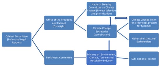 Although Zimbabwe has experienced a range of challenges, many individuals, organisations, and agencies in the country have become actively involved in resolving the impacts of climate change: “Zimbabwe produced its Initial National Communication to the UNFCCC in 1998 and 2013 its Second National Communication; consequently, a National Climate Change Response Strategy was prepared” [57]. The country’s governance structure for climate change is composed of the National Climate Change Department based within the Ministry of the Environment. The National Climate Change Department has the responsibility for engaging with the UNFCCC and for producing National Communications. It also has a “National Climate Change Task Team coordinated by the Office of the President and Cabinet (OPC) with a dedicated Permanent Secretary, who receive a dedicated budget allocation from central government” [57]. The body is responsible for climate change policy analysis, formulation, and review. It also supports national climate change planning, project development, programming, implementation, and monitoring and evaluation. In support of the need for local efforts, the Zimbabwean experiences have revealed that the Environmental Management Agency (EMA) has been accredited as a national implementing entity to the Adaptation Fund.