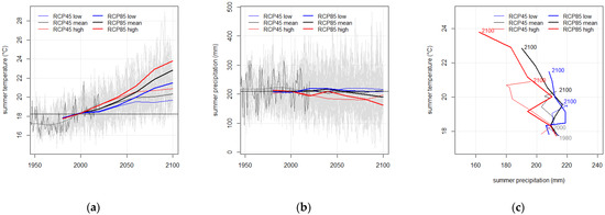 Figure 2a,b show the summer temperature trajectories and summer precipitation trajectories of the six RCP variants for the site Roth on a time axis from 1950–2100. Summer temperatures in the mean, low and high variants split up instantly after 2000, but the RCPs behind the variants only split up after 2040. Figure 2c plots the summer temperature and summer precipitation trajectories directly against each other.