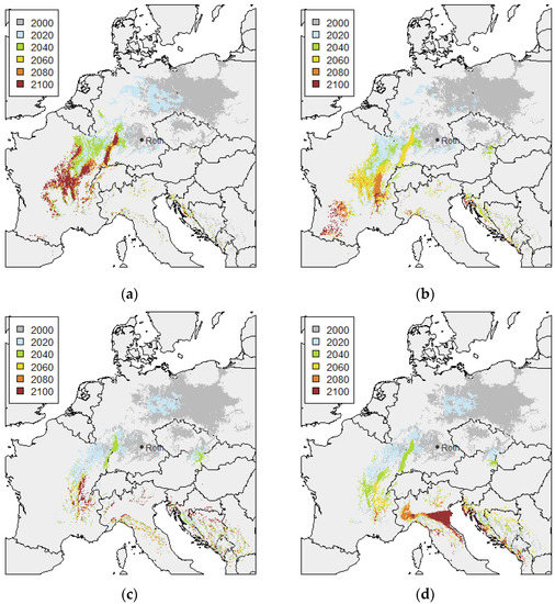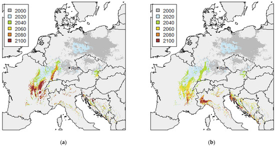 For the future climate projection we downloaded 10 RCP 4.5 and 10 RCP 8.5 climate models from the EURO-CORDEX (definition) domain [63,64]. RCP stands for representative concentration pathway (of greenhouse gases in the atmosphere). The numbers 4.5 and 8.5 quantify the theoretical change in the Earth’s radiation balance (in Watt per m2). There are two more standard RCPs: the numbers 2.6 and 6.0 identify them as one very low and one intermediate pathway between the RCP 4.5 and 8.5. How sensitive the Earth’s climate reacts can be calculated by complex global climate models (GCMs) can only be estimated within a certain range. The uncertainty of climate future, therefore, has two components: (a) which pathway will be realized, and (b) which model matches the climate processes most correctly (for more information please refer to [65]). The EURO-CORDEX initiative provides climate change projections of Europe where regional climate models (RCMs) were used to downscale global climate models (GCMs). Table 1 specifies the four GCMs and the three RCMs that were used for the RCP 4.5 ensemble and the RCP 8.5 ensemble of our study. To avoid processing efforts for (bias) adjustment and self-analogue verification [66] we selected the adjusted model data in EUR11-resolution (~12 km) from the CLIPC project [67]. The adjustment was carried out based on distribution [68] and used EURO4M-MESAN data [69] from 1989–2010 as a reference. At the local scale, climate may still vary considerably due to topoclimatic effects. To account for this local climate variability we employ a simple delta adjustment method [70] that calculates the local difference in mean annual temperature and the ratio of the annual precipitation sum of the 12 km resolved climate model data to the 1 km resolved CHELSA data using 1989–2010 as common reference period.