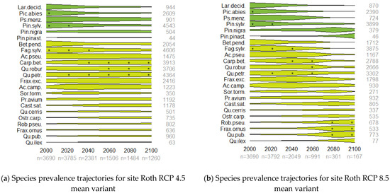 The prevalence trajectory graphics in Figure 5 display the relative prevalence of 23 major tree species in the twin regions along the geographic trajectories of the RCP 4.5 and RCP 8.5 mean variant for the site Roth (corresponding to Figure 3). The graphics of the low and high RCP variants can be viewed in the supplement (Figure S2). The grey numbers below the axis indicate that the number of plots in the twin regions are highest for 2000 and 2020 and decrease towards 2100—in the RCP 8.5 much stronger than in the RCP 4.5. The grey numbers on the right vertical axis are high especially for species with high prevalence between 2000 and 2060. Low counts are typical for species with low prevalence in general or a high prevalence in the much scarcer 2080- and 2100-twin regions.