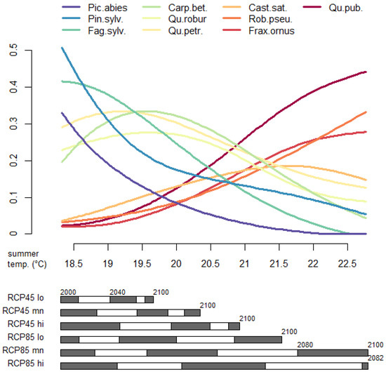 Absolute prevalence of 10 major tree species in the twin regions of the RCP 8.5 mean variant for site Roth, now with summer temperature on the x-axis. Time scales below the x-axis relate the summer temperature in the six RCP variants to the scale of the x-axis. Prevalence curves smoothed and interpolated using a smooth spline with 4 degrees of freedom.