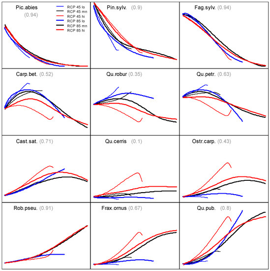 Because the species prevalence plotted in Figure 6 corresponds to the RCP 8.5 mean variant it is important to know where there are differences in the actual species prevalence in the other RCP variants. This is done in Figure 7 for 12 of the 23 species with the same axes as in Figure 6. The thick black line represents the RCP 8.5 mean variant that was displayed in Figure 6. The general trend whether species’ prevalence rises or declines is fairly similar between the variants. In particular, the prevalence of Norway spruce, Scots pine, European beech, chestnut, black locust and pubescent oak are close to the RCP 8.5 mean variant (>70% explained variance). Nonetheless, there are also interesting differences between the RCP variants. Hornbeam, pedunculate and sessile oak have higher prevalence in the low RCP variants (blue), and lower prevalence in the high RCP variants (red)—Turkey oak, hop-hornbeam, and manna-ash the opposite. Differences between the two variants are that (for a given summer temperature) the low variants have higher summer precipitation and winter temperatures (see Table 2 and Figure 2). The summer precipitation of the high RCP 4.5 variant in particular is between 2040 and 2080 lower than the RCP 8.5 mean variant. This leads to a temporary early and strong decrease in the case of hornbeam, pedunculate and sessile oak, and a temporary early and strong increase in Turkey oak, hop-hornbeam, manna-ash and pubescent oak in the high RCP 4.5 variant.