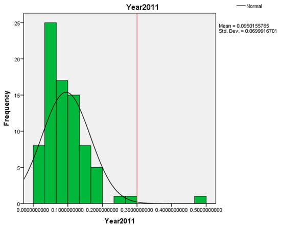 Histogram showing the Std. Devs. in IBM-SPSS for the variable analyzed for the year 2011. Source: Author’s computation in IBM SPSS.