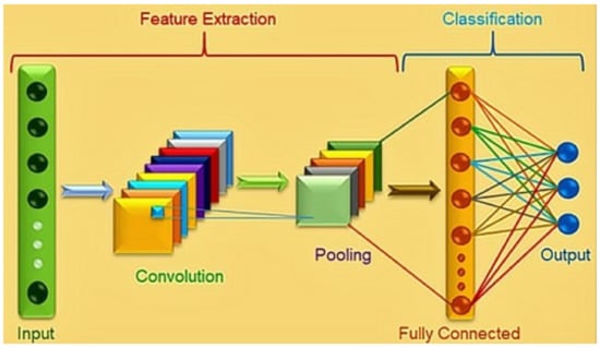 One of the deep learning models, CNNs, includes several layers called convolutional, pooling and fully connected (Figure 2). The function of convolutional layers is feature extractions, while pooling layers function as compressors, and fully connected layers make the classification. Image features are extracted, and a convolutional layer learns representations of image features. Several filters are a given stride used to perform a 3-D convolution and produce feature maps from the input image. At the output of the layer, each feature map represents features extracted from locations of the input image with the help of one set of shared weights. A pooling layer is used to modify the output results of the convolutional layer. The low-level feature representation could be transformed into high-level feature representation, which is approximately invariant to small translations of the input by using pooling function, reducing the dimensionality of each feature map but retaining the essential information. The fully connected layer consists of the weights, biases, and neurons and connects the neurons between two different layers. These layers are usually placed before the output layer [].