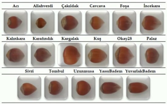 Seventeen hazelnut varieties commonly grown in Turkey were used in our study (Figure 3). The hazelnuts were obtained from the Republic of Turkey Ministry of Agriculture and Forestry Hazelnut Research Institute. A camera with a resolution of 14.1 megapixels was used in taking the images. All images were taken from the same distance (20 cm) with a special setup. Light difference was taken into consideration while taking the images. Two hundred fifty images were taken for each variety. The images were obtained in two seasons as 2019 and 2020 to ensure variation.