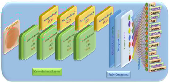 CNNs are very effective for classification and recognition, and they decrease errors in classification significantly []. Although CNNs have received much more attention than other machine learning algorithms, they have not been used in hazelnut researches, and not a single article using CNN has been reported on this topic.