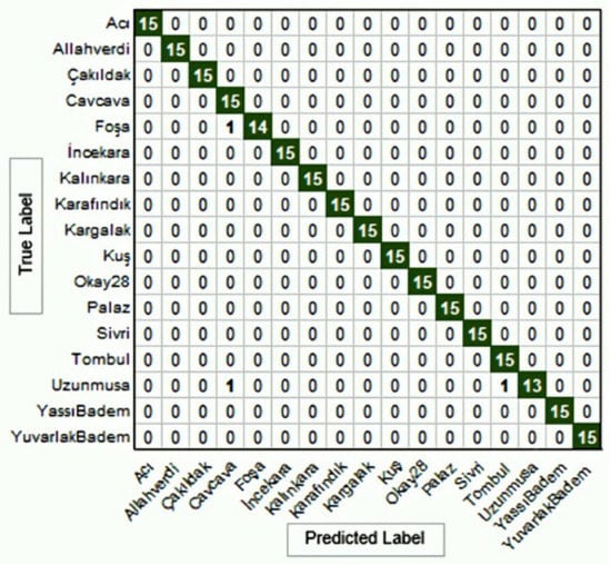 In the test set, general classification accuracy rates of VGG16, VGG19, InceptionV3, and ResNet50 models were 73.14%, 72.14%, 61.18%, and 80.00%, respectively (Table 3). No suitable method was found for the classification of hazelnut varieties from these pre-trained models. It was found that the proposed Lprtnr1 model had sufficient potential to classify the 17 hazelnut varieties.