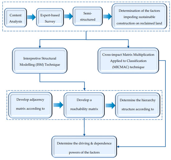 An integrated analysis was employed to attain the objectives of this study. The analysis entails determining the hierarchical structure of governing factors from driving power to driven power perspective or position. The established hierarchical structure is considered valuable in interpreting the complex relationship between the impediments. The structure was formed using the interpretive structural modeling technique to describe and simplify the intricate correlation between variables. The study utilized a hybrid interpretive structural modeling (ISM) and cross-impact matrix multiplication applied to classification (MICMAC) approach to evaluate the extent to which each factor could promote the safety and serviceability of infrastructure constructed on reclaimed lands. This hybrid approach helped to set up a structure within the set of the determined factors. A structural model was created for the factors according to the direct and indirect relationships among them. These relationships among the factors describe the complexities of the safety and serviceability of infrastructure construction on the reclaimed land more accurately than the individual factors considered separately. Therefore, the adoption of the hybrid approach provided insights into collective understandings of these interrelationships among the factors. The techniques adopted for achieving the aim of this paper are presented in the sections that follow.