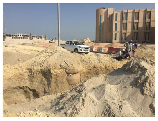 The whole study area has complex and problematic subsoil conditions. The explorable strata of the region is mainly composed of loose sand with numerous salts, commonly termed as sabkha [3,4]. These salts occur as crusts on the surface or in the dissolved form in soil moisture [20]. Previous studies [21,22,23,24] revealed that magnesium, calcium, sulphates, sodium, chlorides, and carbonates of calcium dominate the salt precipitation in the Middle Eastern desert region. The bond between the soil grains is weakened by the presence of crystalized salt. The variation in the strength, consistency, and expansive characteristics of salt-bearing sabkha soil is further extrapolated by the changes in moisture content and extreme environmental conditions of the region [6,7,25]. Relatively shallow layers of soft and loose deposits overlying medium-dense to dense sands are observed in the low-lying coastal areas. Sabkha soils are usually associated with a shallow groundwater table, and in the study area it is generally located at a depth of less than 1.5 m below the ground surface.