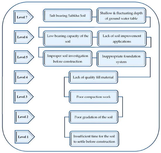 A close observation of the hierarchical structure of all factors is shown in Figure 6. It can be easily seen that the driving factors, which include salt-bearing sabkha soil (F9) and shallow and fluctuating depth of the groundwater table (F10), make up the top level of the hierarchical structure (Level 7). As discussed earlier, sabkha soil has highly expansive behavior, which is adversely extrapolated by the shallow and fluctuating groundwater table in the coastal region. Such soils usually have very low bearing capacity and are not capable of safely carrying the loads applied on them. Conclusively, the aforementioned driving factors play a vital role in causing excessive settlement and shear failure, which affects the safety and serviceability of the infrastructure built on the problematic sabkha soils. Thus, policymakers should give high priority to these factors to improve the safety and serviceability of infrastructure construction on reclaimed land. While the highest priority should be given to the problematic salt-bearing sabkha soil (F9) and shallow and fluctuating depth of the groundwater table (F10), the importance of lack of soil improvement applications (F6) and low bearing capacity of the soil (F5) cannot be overemphasized. A methodical ground improvement to enhance the bearing capacity and reduce the possibility of potential settlement/failure is the only workaround solution for problematic soil like sabkha formations. Different soil improvement techniques are employed to enhance the strength and deformation characteristics of such soils. However, these soil improvement practices were rarely observed in the study area due to lack of awareness and the associated increase in the initial cost of the project. Considering the importance of the problems posed by sabkha soil, a number of studies [37,38,39] have sought to improving its strength and deformation characteristics. Furthermore, there is a need to investigate the performance of traditional soil improvement materials and practices for severe environmental conditions, i.e., the presence of water and different types of salts.