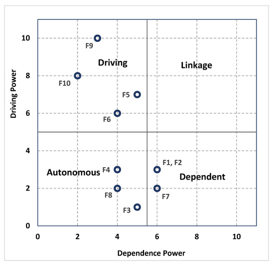 Figure 7 presents the driving and dependence powers of all the factors. As shown in the Figure, the factors were grouped into driving, linkage, autonomous, and dependent factors. The driving factors possess very high driving strength and weak dependence strength. The factors F5, F6, F9, and F10 are the driving barriers in this case and have the propensity to affect other factors. Conclusively, these factors are crucial to the enhancement of the safety and serviceability of infrastructure constructed on reclaimed land in the Eastern Province of Saudi Arabia. Accordingly, the factors ought to be given due consideration during policy formulation to ensure the safety and serviceability of the huge infrastructure construction being undertaken in the region.