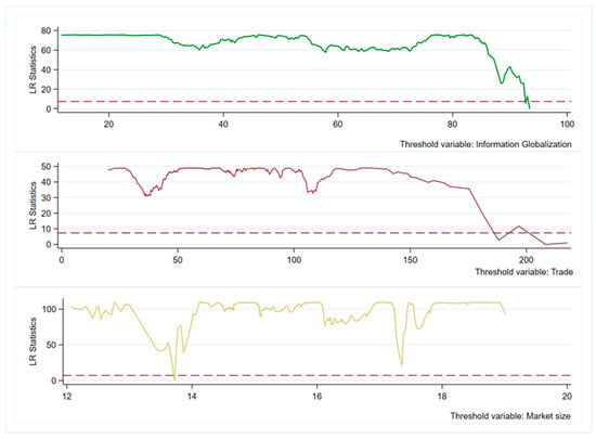 The main advantage of using the threshold method is that it allows you to capture the non-linearity of the relationship between pollutant gas emissions, globalization, trade, and market size. Furthermore, it makes it possible to know exactly the inflection point of the threshold variables. Figure 2 shows the LR statistics and the three variables’ threshold values: IGI, trade, and market size.