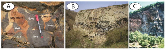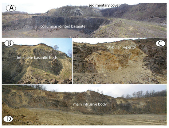 - Martin, U.; Nemeth, K. Peperitic lava lake-fed sills at Sag-hegy, western Hungary: A complex interaction of a wet tephra ring and lava. In Physical Geology of High-Level Magmatic Systems; Breitkreuz, C., Petford, N., Eds.; Geological Society Special Publication: London, UK, 2004; Volume 234, pp. 33–50. [Google Scholar]